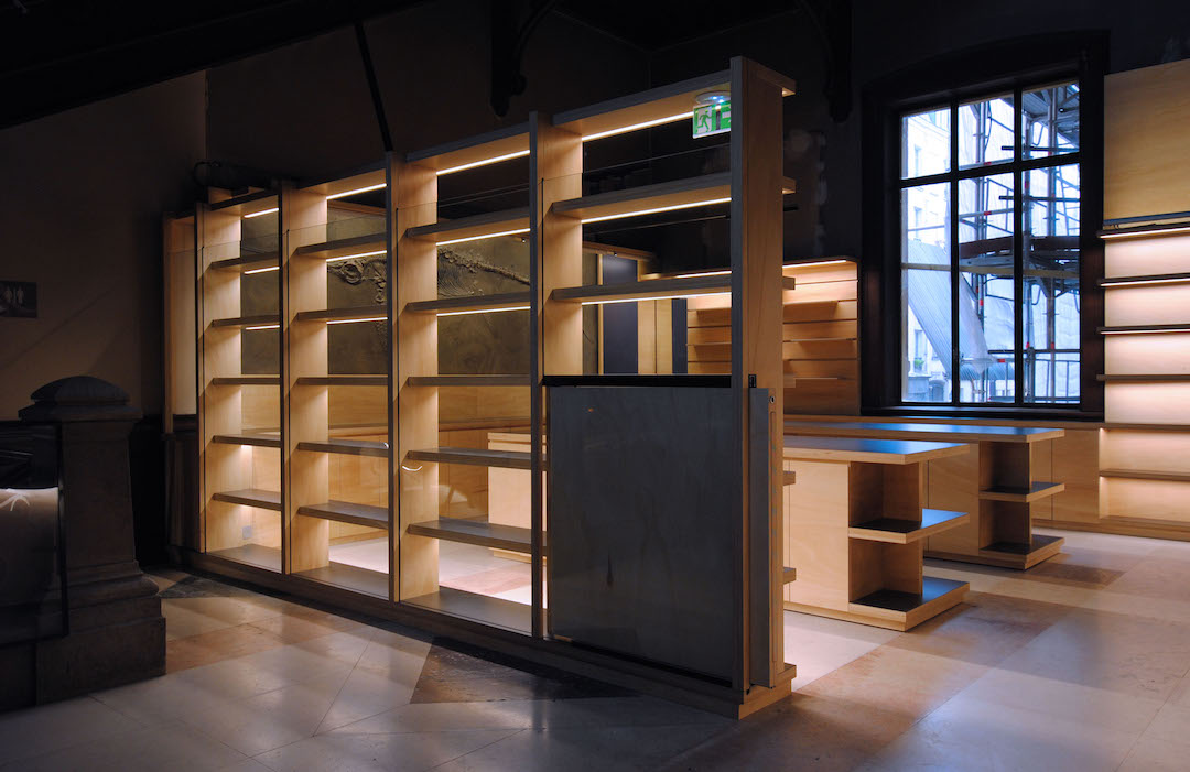 Le nouveau mobilier est réalisé en contreplaqué massif et épais de 50 mm revêtu de stratifié. Il intègre des vitrines et l'essentiel de l'éclairage du hall.